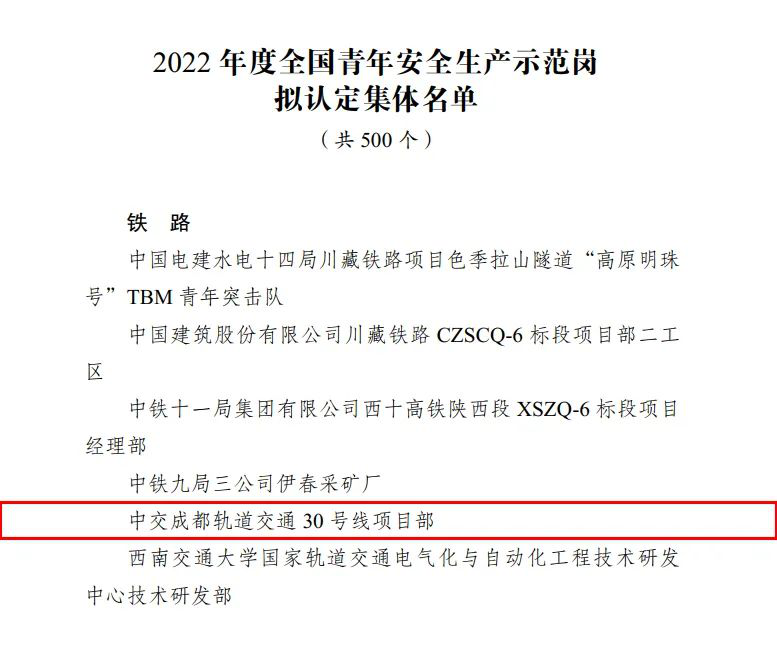 近日,在2022年度全国青年安全生产示范岗创建活动中,成都地铁30号线青年集体被认定为“2022年度全国青年安全生产示范岗”。