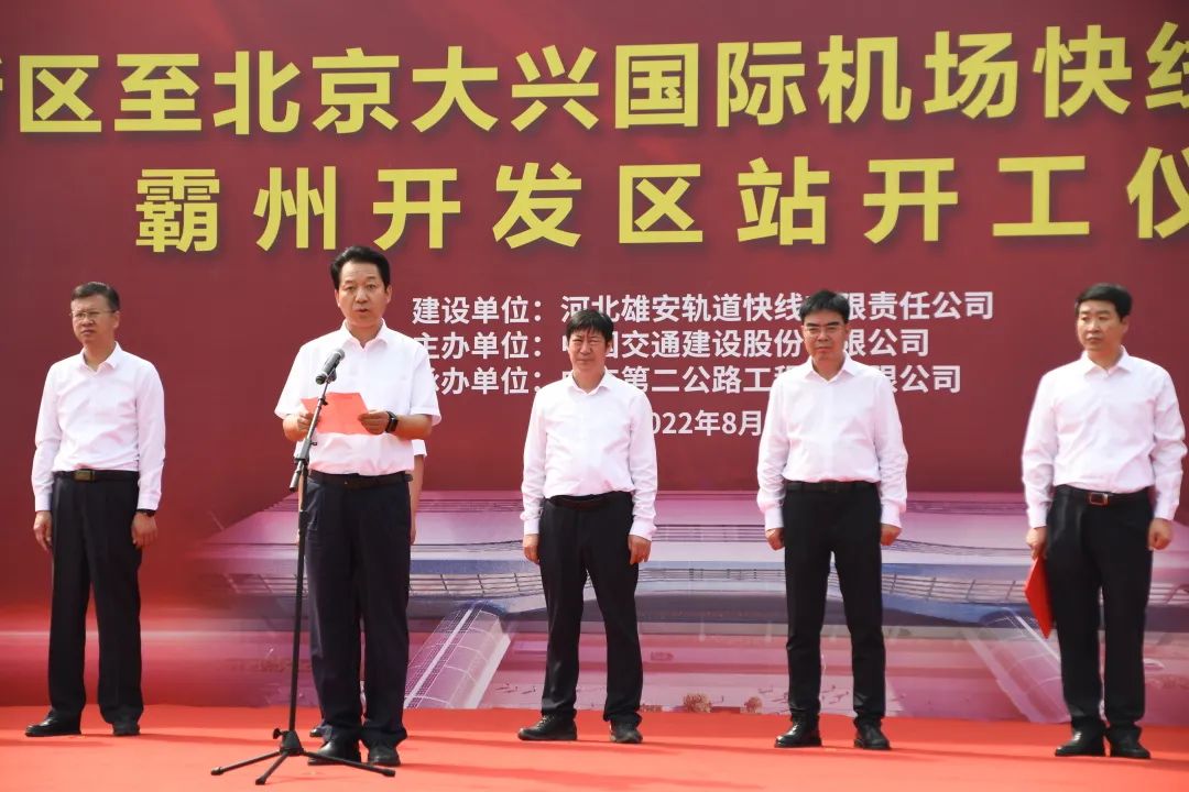 8月21日,雄安新区至北京大兴国际机场快线(R1线)项目霸州开发区站开工仪式在河北霸州举行。中国交建轨道交通事业部(轨道交通分公司)总经理,铁道总院党委书记、董事长安爱军应邀出席开工仪式并致辞。廊坊市发改委副主任张志强,霸州市委常委、副书记吴全通,市政府副市长张树增,中国雄安集团党委副书记、总经理刘中林,雄商发展公司党委书记、总经理,轨道快线公司党总支书记、总经理韩建友,中交二公局副总经理王海宝及相关单位和项目负责人参加开工仪式。