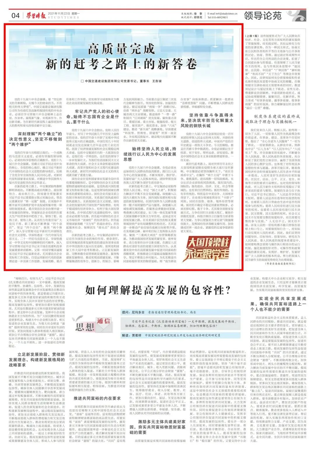 在新的赶考之路上,中交集团始终旗帜鲜明讲政治,不断提高政治判断力、政治领悟力、政治执行力,持续健全贯彻落实习近平总书记重要指示批示实施办法,常态长效落实好“第一议题”制度,在实践中不断丰富并完善维护党中央权威和集中统一领导的制度体系,重点突出在企业治理中进一步加强党的领导,坚强保证企业党组织在重大生产经营事项中把得了关、掌得了舵、说得上话、使得上劲,从而有力有效引导广大党员干部、职工群众不断增强“四个意识”、坚定“四个自信”、做到“两个维护”。深入学习贯彻习近平新时代中国特色社会主义思想,学深悟透这一当代中国马克思主义、二十一世纪马克思主义,学深悟透这一中华文化和中国精神的时代精华,深入学习贯彻习近平总书记关于国企党建和改革发展重要讲话精神,又第一时间学懂弄通做实习近平总书记最新论述,尤其要结合企业实际和工作实际,自觉运用新时代党的创新理论进一步完善工作思路、发展战略、重点任务和工作举措,切实将学习成效转化为推动企业高质量发展的实践成效。